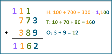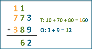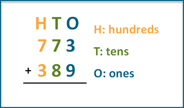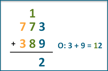 For example, let’s use the above example: 773 + 389. In this case, you need to regroup. Let’s take this step by step.