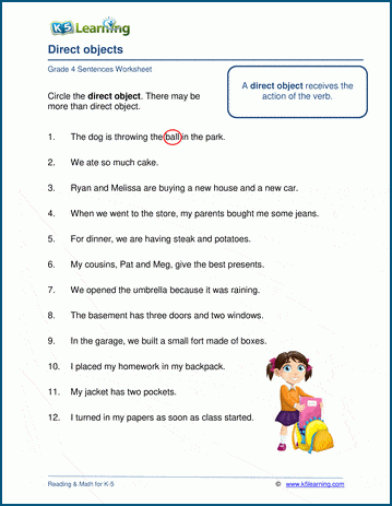 Our grade 4 worksheets ask students to circle the direct objects in longer sentences.