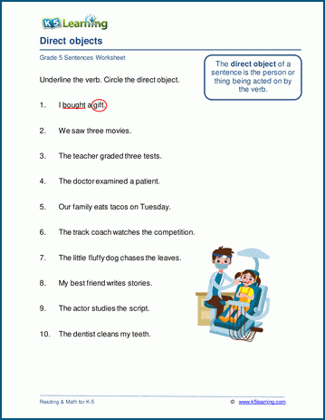 Students practice direct objects in many grades. We have created worksheets for practice in grades 3, 4 and 5 with increasing difficulty levels.