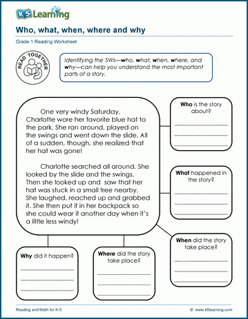 The final set of worksheets ask students to identify the who, what, when, where and why of stories.