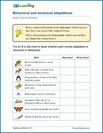 Students make the distinction between structural and behavioral adaptations in these worksheets.