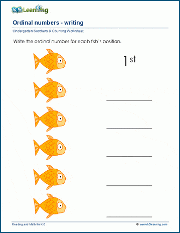 In our kindergarten numbers and counting section, we have a series of worksheets to help students practice the numbers and the words we use to define ordinal positions.