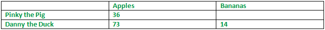Let’s say Pinky the Pig bought 3 apples and Danny the Duck 7 apples and 1 banana. Now, how many apples have they bought together? With 3 apples and 7 apples bought, the total number of apples is 10.