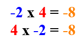 For example: -2 x 4, which in essence is the same as -2 + (-2) + (-2) + (-2)