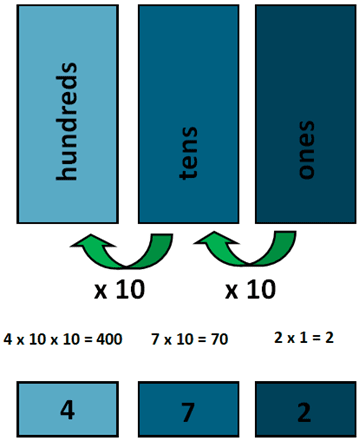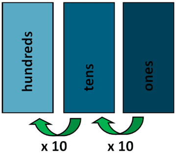 In 3-digit numbers, students learning about the positions of ones, tens and hundreds. As you can see, each number has the value 10 times that of the number on its right: