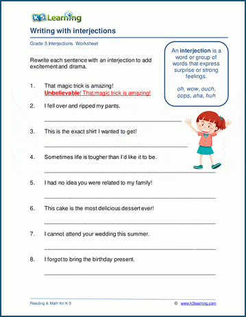 We’ve created a number of worksheets in our grade 5 grammar section for students to practice interjections.