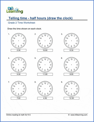 Students who need to practice telling time by the half hours, these worksheets fit the bill.