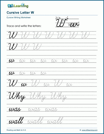 Students practice writing the letter "W" in upper and lower case in these printable cursive writing worksheets.