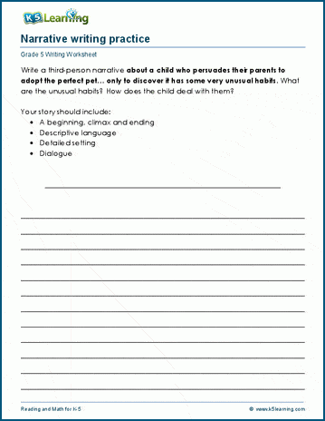 Students write a third person narrative about a child who persuades their parents to adopt what seems like the perfect pet, but to only realize that the chosen pet possesses some unexpected habits.