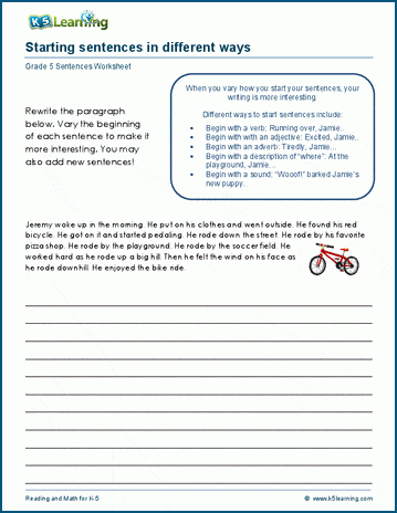 Writing is more interesting when sentences begin in a variety of ways. In these writing worksheets, students re-write paragraphs with a variety of sentence beginnings.