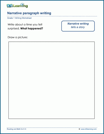 Students write a narrative paragraph about a time when they felt surprised. The paragraph structure includes a topic sentence, sentences for "first, next, last" and a conclusion.