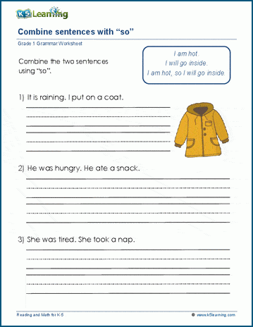 Students combine two simple sentences using the conjunction "so" and a comma. Emphasize that we use "so" instead of "and" when we want to convey a causal relationship.
