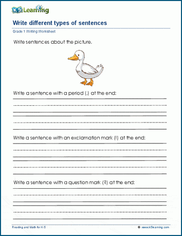 In each worksheet, students write 3 sentences about the same picture: one statement, one question and one exclamation. The exercise reinforces the three basic types of sentences and their ending punctuation.