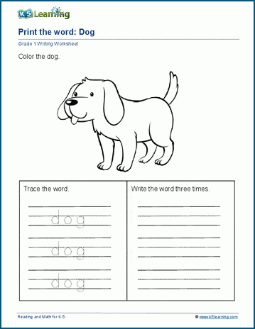 Students color the drawing and trace and print the word three times. The final worksheet allows the student to choose his own word / object.