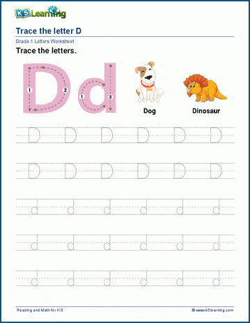 Tracing and printing practice for the letter D, uppercase and lowercase.
