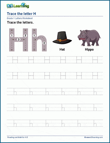 Tracing and printing practice for the letter H, uppercase and lowercase.