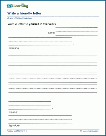 Students write a friendly letter to themselves, guided by the template which provides the form of the letter (date, greeting, closing, signature).