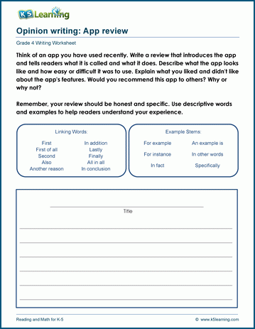 Students express their opinions by writing a review of an app they have used. Sample linking words and sentence stems are provided.