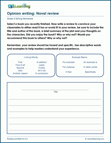 Students express their opinions by writing a review of a novel they have read. Sample linking words and sentence stems are provided.