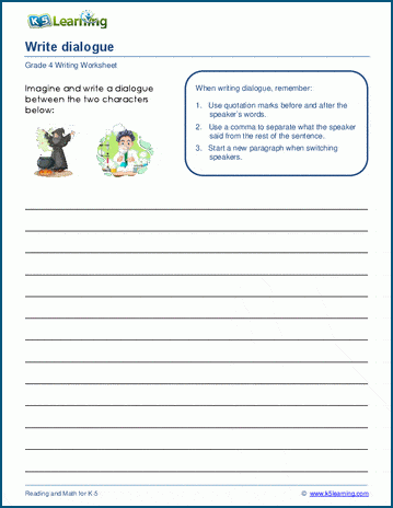 Students write a text containing dialogue between two characters; proper use of punctuation is the emphasis of these worksheets.