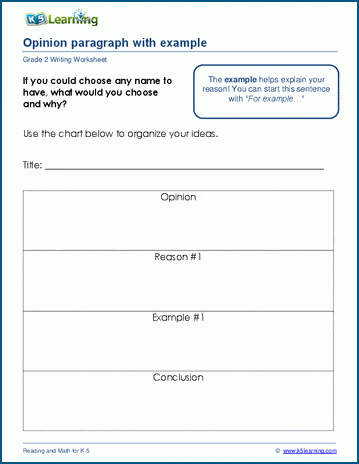 A writing prompt and organizing chart is used to help students write an opinion paragraph including an opinion statement, their reason, an example and a conclusion.