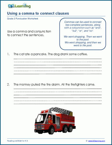 Commas are used when we combine two complete sentences into one compound sentence. In these worksheets, students use commas and the conjunctions and, but, or and so to create compound sentences from two simple sentences.