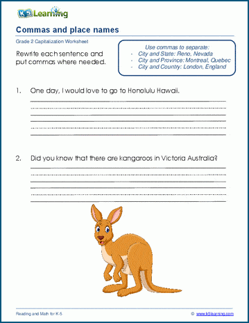 It is conventional to write place names with commas separating the city and state or city and country (Paris, France). In each worksheet, students correct 6 sentences by adding commas to place names.