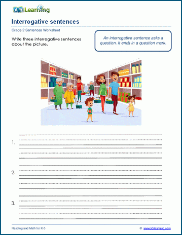 Interrogative sentences ask questions and end in a question mark. Students write 3 interrogative sentences about a picture in each of these writing worksheets.