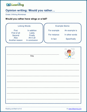 Students are prompted to write an opinion piece about whether they would rather have wings or a tail.