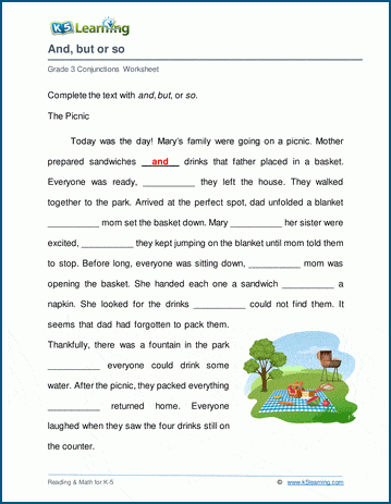 Conjunctions are used to connect words and phrases; these worksheets provide students practice in using the very common conjunctions and, but & so.