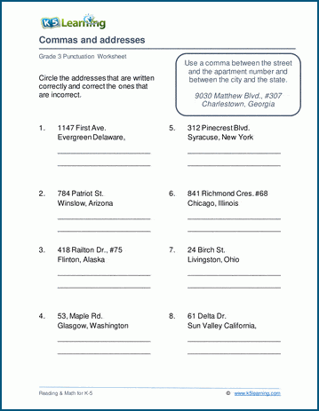 In these worksheets, students identify and fix comma errors in addresses. Commas should be placed between street names and apartment numbers and between the city and the state names.