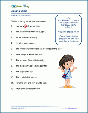 A linking verb (am, is, are, was .....) connects the subject to words describing the subject (e.g. The man is tall). In these worksheets, students identify linking verbs in sentences.