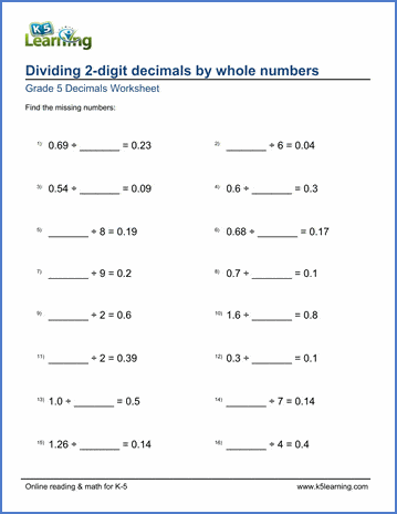 Students find the missing quotient, divisor or dividend. All equations consist of a decimal number divided by whole numbers. There is no rounding required in these worksheets.