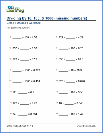 Below are our grade 5 math worksheets on dividing whole numbers by 10, 100 or 1,000; in each equation one of the dividend ,the divisor or the quotient is missing.