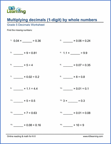 In these grade 5 math worksheets, students find the missing factors of multiplication equations with a one-digit decimal and a whole number as factors.
