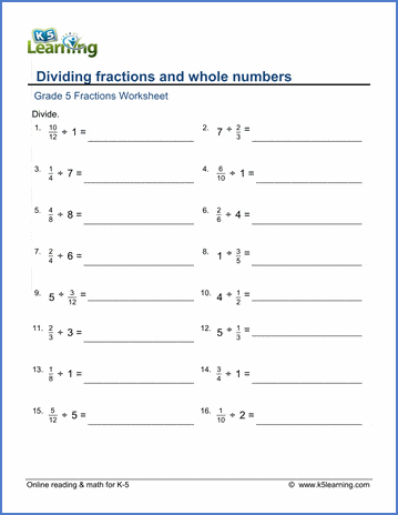 These grade 5 math worksheets combine dividing fractions by whole numbers and dividing whole numbers by fractions.