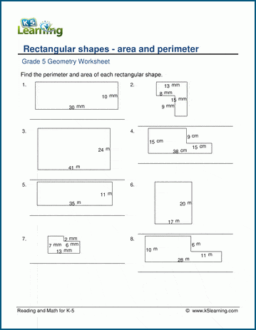 Students find the area and perimeter of irregular rectangular shapes using metric units (mm, cm, m).