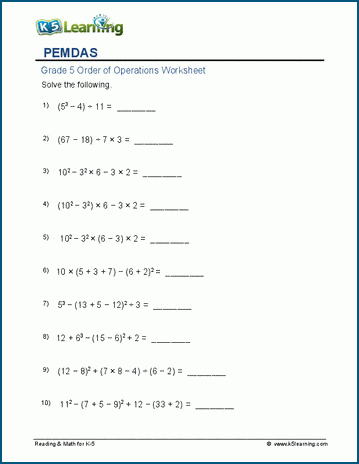 These order of operations worksheets include the 4 operations, parenthesis and exponents. PEMDAS is the acronym for remembering the order in which to do calculations.