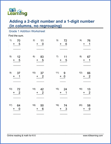 Students add a 2-digit number and a 1-digit number in columns in these addition worksheets.