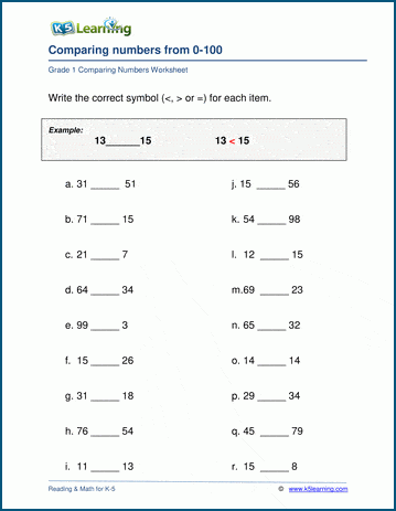 Students use "greater than" (>), "less than" (<) and "equal to" (=) symbols to compare pairs of numbers. All numbers are less than 100.