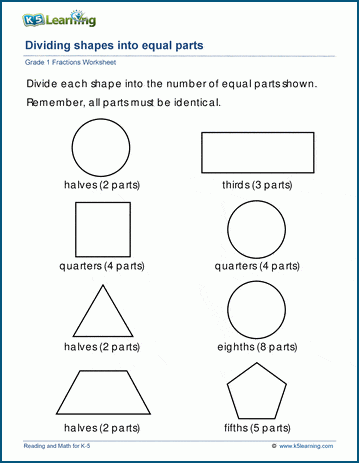 Explore all of our fractions worksheets, from dividing shapes into "equal parts" to multiplying and dividing improper fractions and mixed numbers.
