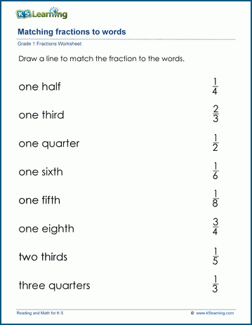 Students to match simple fractions in fraction notation ("1/3") with the same fractions expressed in words ("one third"). Students should say "one third" rather than "one over three" if possible.