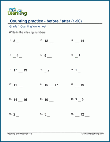 Students fill in the blanks with the number that came before or after. Number ranges are from 1-20, 1-30, 1-50 or 1-100.