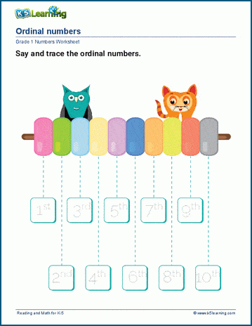 Ordinal numbers (1st, 2nd, 3rd ....) define an object's position in a series. In these worksheets, students practice writing and using ordinal numbers.