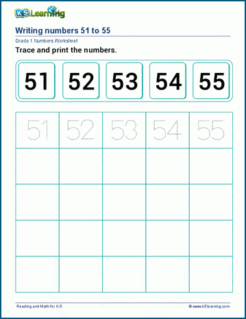 Tracing and printing numbers helps build number recognition. This set of printing numbers worksheets covers 51-75.