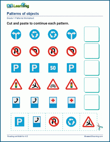 Students extend patterns of images by cutting and pasting. Patterns have 2 or 3 repeating elements.