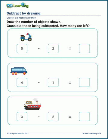 These worksheets ask students to solve simple subtraction questions by first drawing the original number of objects and then crossing out the number of objects being "taken away".