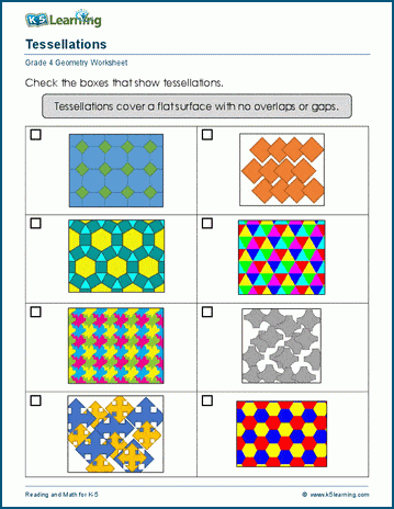 Tessellations cover a flat surface with no overlaps or gaps. In these geometry worksheets, students identify tessellations and shapes that can form tessellations.