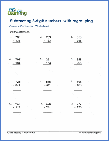 Students subtract 3-digit numbers in columns; regrouping (or 'borrowing') will be required.