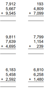 These addition worksheets range from adding one and two digit numbers mentally to addition of three or more large numbers. Emphasis is on building skills for the addition of large numbers in columns with regrouping.